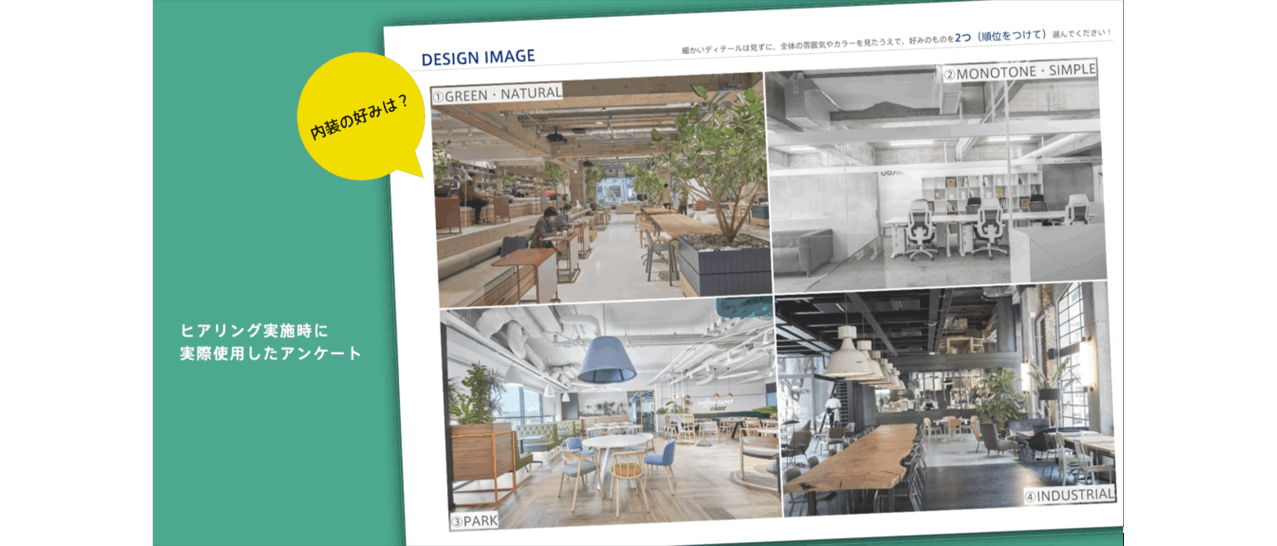 「みんなで創る」を具現化するため、デザインチームは全社員に対し、写真付きで4つのデザイン要素(ナチュラルウッド/インダストリアル/モノトーン/パーク)の中から好みの内装テイストを選ぶアンケートを実施しました。