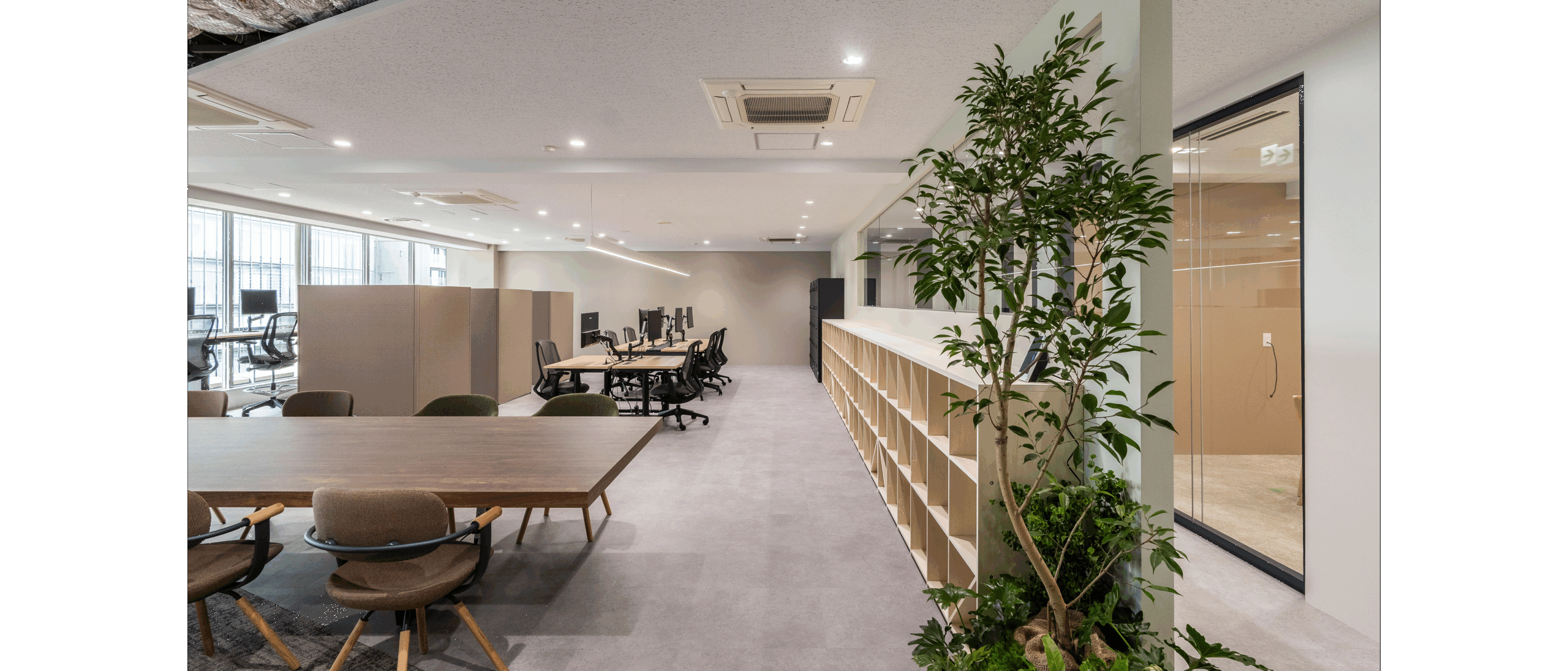 また会議室についても、当初は壁にする予定でしたが、ビルとビルの間から見える青山霊園の豊かな緑と、外からの光をオフィス全体に取り込みたいという想いから、工事直前という段階で全面ガラス化を決定。これは空間の明るさだけでなく、開放感や洗練された印象をもたらす大きな決断でした。